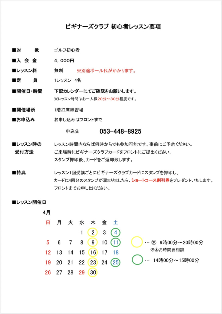 4月のビギナーズクラブ無料レッスンの予定が出ました。